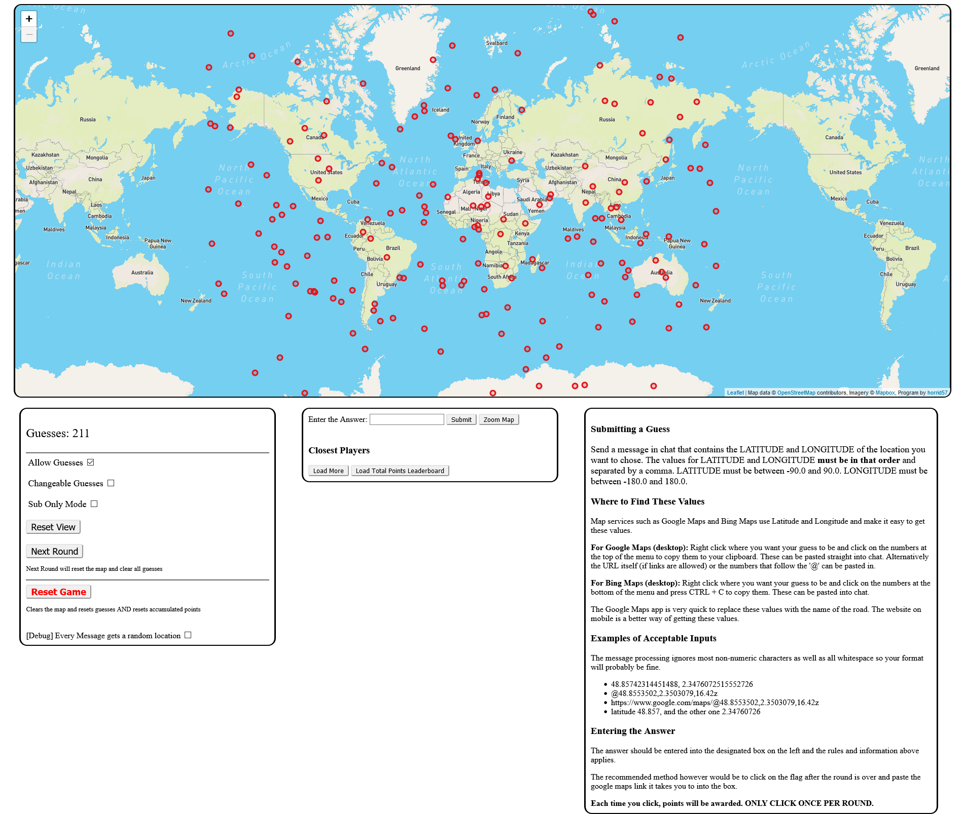 Connect to your twitch chat and allow everyone to guess the GeoGuessr location by typing "Latitude, Longitude" in chat.